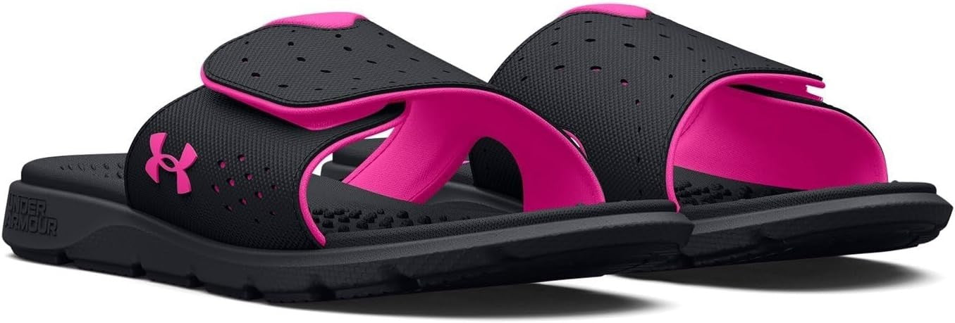 The Under Armour Women's Ignite Pro Sandals Slides are comfortable slip-on sandals perfect for travel and casual occasions during the summer and spring seasons. These solid sandals feature a flat heel and medium width, with a fabric lining for added comfort. The synthetic upper material and rubber outsole provide durability, while the foam insole adds extra cushioning. The signature Under Armour logo accents add a stylish touch to these versatile slides.