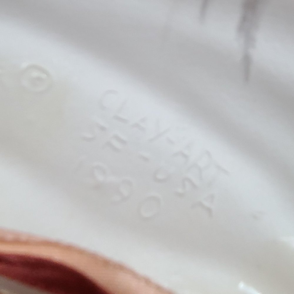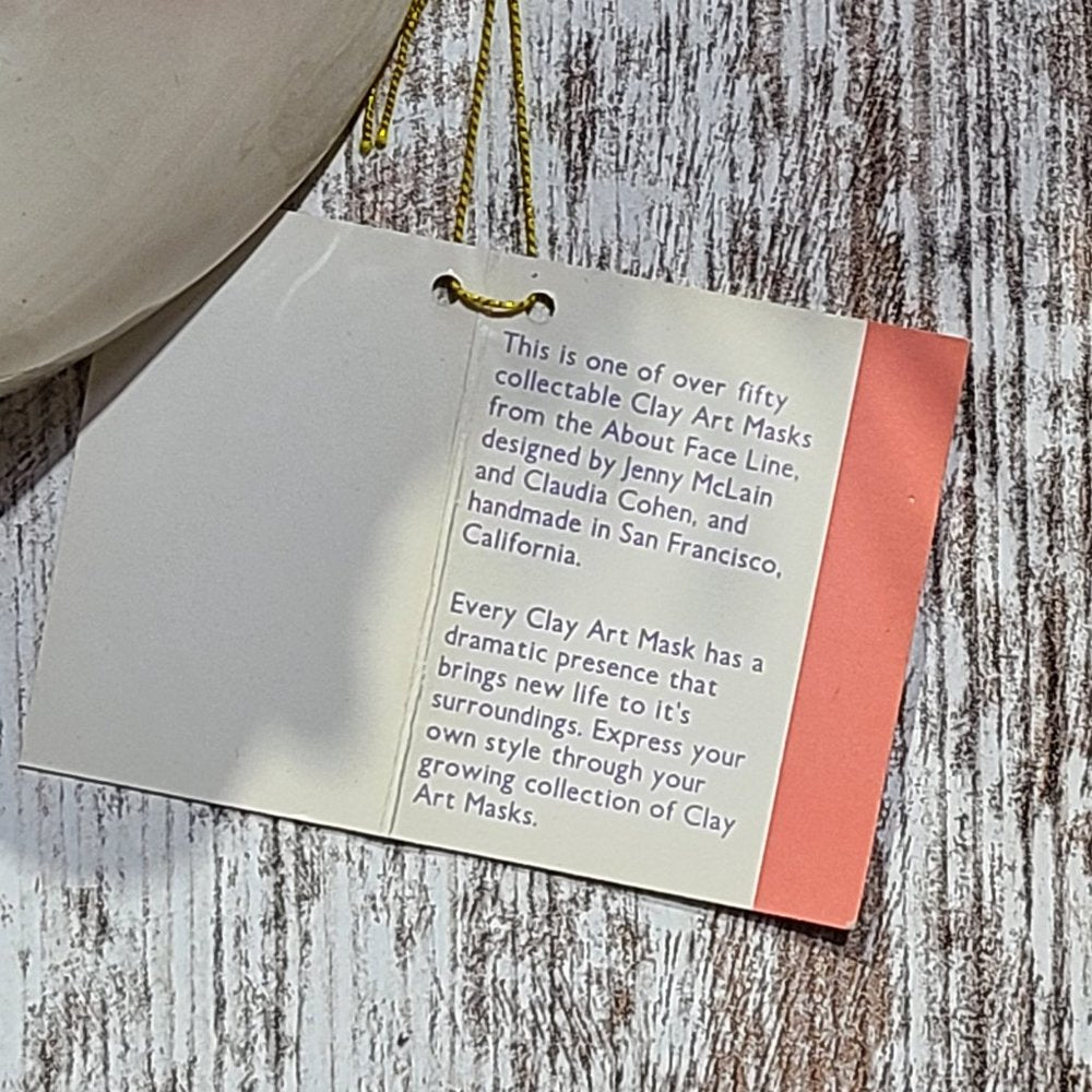 Clay Art About Face Feathered Pink and Orange Lady Face Hanging Mask. This is one of over fifty collectable Clay Art Masks from the About Face Line, designed by Jenny McLain and Claudia Cohen, and handmade in San Francisco, California in the 1990's. Every Clay Art Mask has a dramatic presence that brings new life to it's surroundings. The mask's dimension's including the feathers and hanging ribbons are approximately 14in. x 9in. x 4in. The face portion of the mask excluding the feathers and ribbons is approximately 8 in. x 7in. x 4in. The mask weighs 12.5 ounces. **Brand new with tags, display model, not in original box or packaging. 100% authenticity guaranteed backed by our full reimbursement policy**