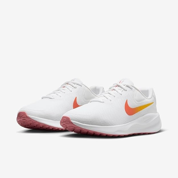 The Women's Nike Revolution 7 Wide Road Running Shoes in White/Magic Ember are designed for active women who enjoy running and jogging. These sneakers feature a lace-up closure and a wide shoe width for a comfortable fit. The shoes have a solid pattern with Nike logo accents and are crafted with a blended fabric upper and a synthetic lining. The rubber outsole provides traction and support for various athletic activities, making them ideal for summer, fall, and spring seasons. These Nike shoes are part of the Nike Revolution product line and offer both style and performance for women on the go.